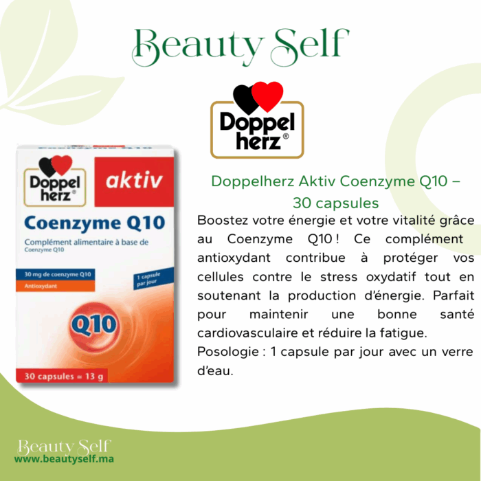Le Doppelherz Aktiv Coenzyme Q10 est un complément alimentaire formulé avec 30 mg de Coenzyme Q10 par capsule, une molécule naturellement présente dans l’organisme et essentielle à la production d’énergie cellulaire.
