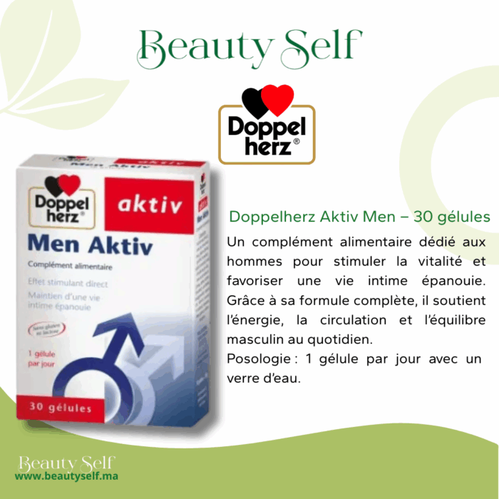 Le complément alimentaire Doppelherz Aktiv Men est spécialement conçu pour soutenir la vitalité masculine et le maintien d’une vie intime épanouie. Sa formule innovante combine des extraits naturels et des nutriments essentiels qui favorisent l’énergie, la circulation sanguine et l’endurance.