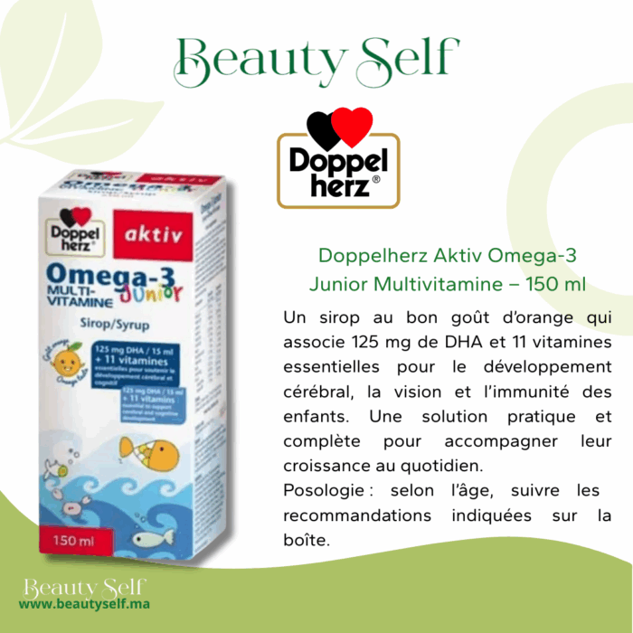 Accueil Santé et nutrition Doppelherz Aktiv Omega-3 Junior Multivitamine – Sirop 150 ml | Développement cérébral et immunité